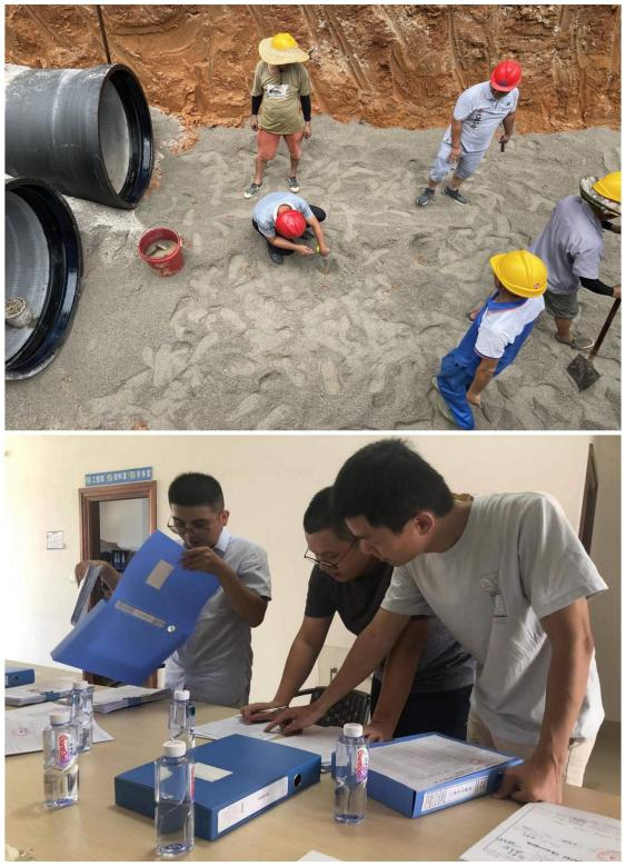 施工現(xiàn)場,安全小組同監(jiān)理單位對管道周圍施工環(huán)境、現(xiàn)場安全防護措施、施工質(zhì)量、項目安全資料等進行全面檢查。在原水輸水管道(高鐵~水廠段)項目工地發(fā)現(xiàn)以下安全問題:一是管道施工時邊坡放坡不合理;二是管道回填砂數(shù)量不足;三是開挖現(xiàn)場邊坡堆土較高,未按規(guī)范要求進行堆土;四是部分工人安全防護措施未到位。安全小組當(dāng)場開具整改通知單,要求施工單位于811日前根據(jù)上述問題按相應(yīng)規(guī)范要求制定措施整改完畢并書面回復(fù),待復(fù)查。